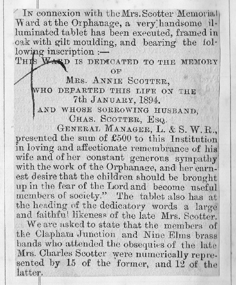 When Charles Scotter's wife, Mrs Annie Scotter, died he made a donation of £500, a considerable sum, to the Railwaymen's Orphanage where a ward was dedicated to her memory. She had displayed "constant generous sympathy with the work of the orphanage". | |