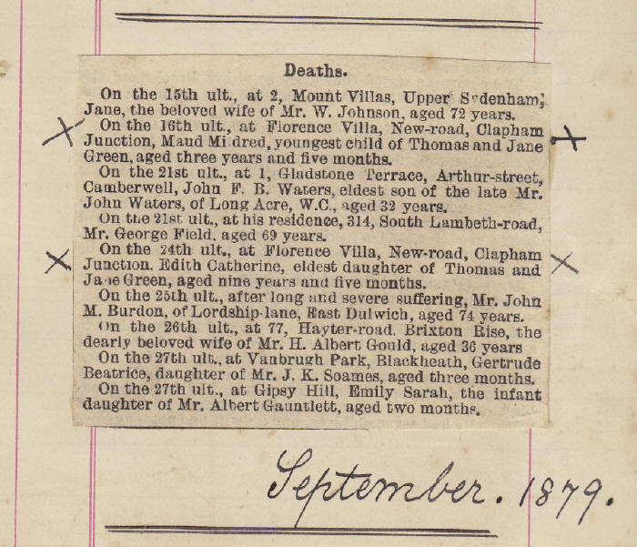 The remainder of his family were born whilst he was at Clapham Junction: Edith, Ernest, Madeline, Maud, and Ada. Sadly in 1879 during this period Edith (aged 9) and Maud (aged 3) died within a week of each other, but it is unclear what the cause was.