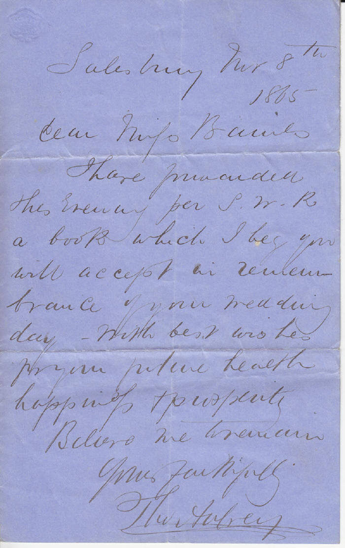 On 9th November 1865, Thomas married Jane Barnes (born 23 February 1843) at The Parish Church of St Mary's in Andover with the Rev C. H. Ridding conducting the ceremony. It is not clear how they met but it appears that she was presented with a book by the S.W.R [South Western Railway] "in remembrance of your [Jane's] wedding day - with best wishes for your future health, happiness, and prosperity".