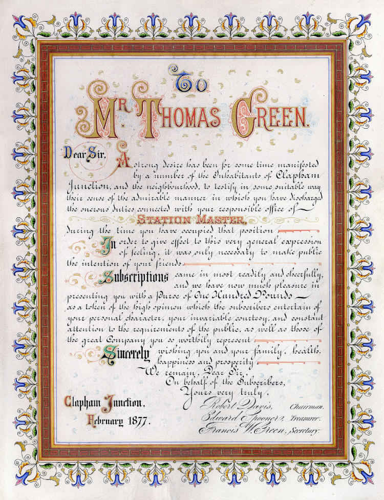 Thomas was to stay at Clapham Junction for twenty years, where he made his mark. In February 1877 he received a special presentation from local businessmen, passengers, and staff. A collection was made which raised £120. After paying for expenses and the printing of an illuminated address £100 was left to present to Mr Green, an enormous sum at that time, when his annual salary was £160. A letter accompanying the illuminated address read as follows: