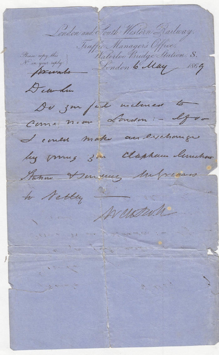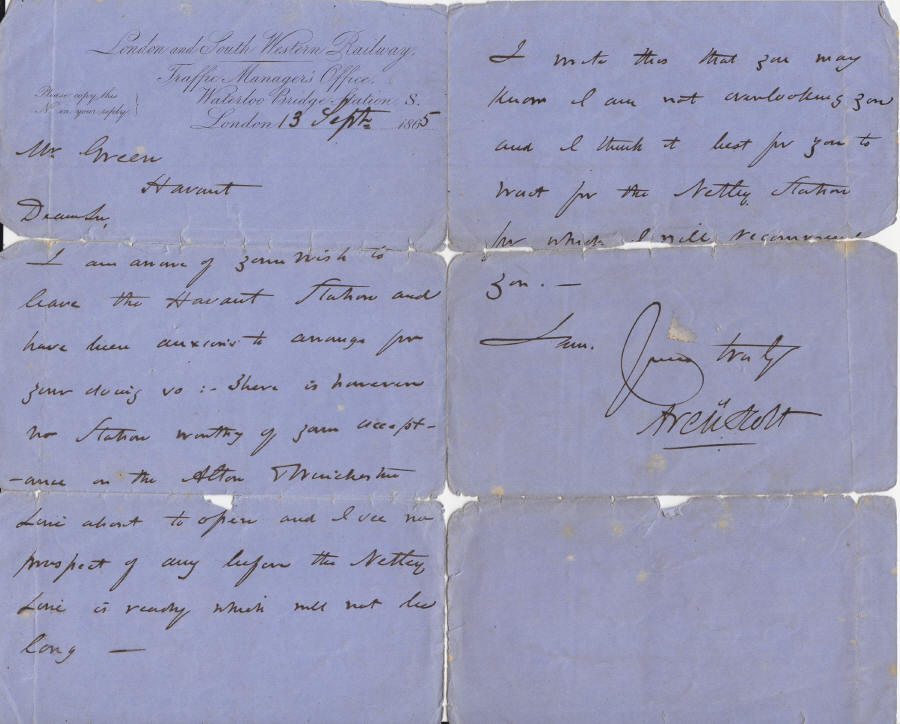 I am aware of your wish to leave the Havant Station and have been anxious to arrange for you to do so: - there is however no station worthy of your acceptance on the Alton to Winchester line about to open and I've no prospect of any before the Netley Line is ready which will not be long. I note this, that you may know, that I am not overlooking you and think it best for you to wait for the Netley Station for which I will recommend you."