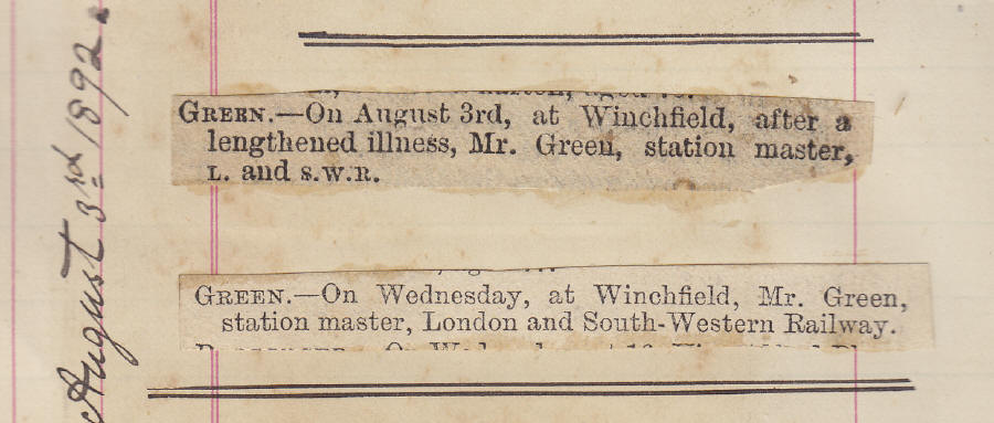 "The death of Mr T. Green, Station Master at Winchfield was reported and a letter was submitted from the widow [Jane] asking for assistance from the company, she being left with two children unprovided for beyond the money repayable from the superannuation fund. £10 donation may be given to the widow."