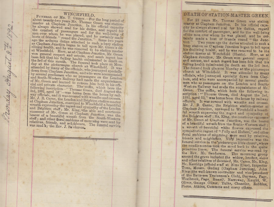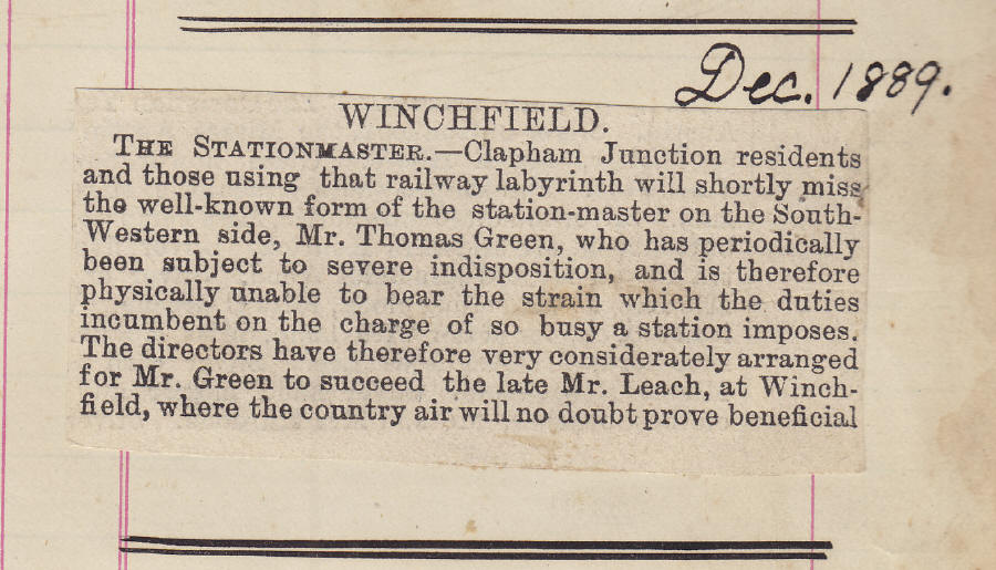 "Mr T. Green, Station Master at Clapham Junction to be removed to Winchfield vice Leach deceased at a salary of £125 a year.