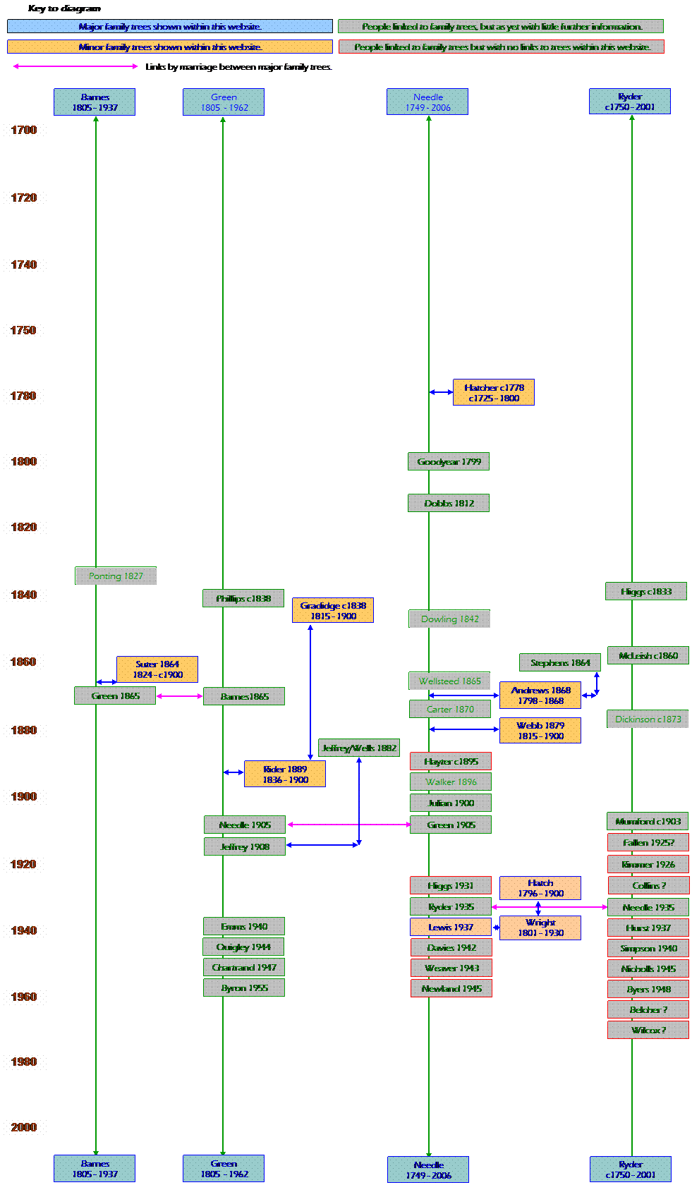 Listed under each surname along the green timeline, are those surnames that married into or are linked to that surname tree. The year date shows the year of the marriage.